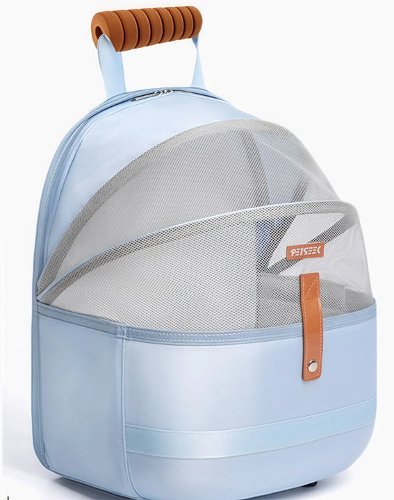 I was worried my shy Oreo would hate carriers, but he curled up in this backpack right away! The light beige color is cute, and the leather strap adds a nice touch. The wheels glide smoothly on sidewalks, and the mesh keeps air flowing. Perfect for vet visits or park days!