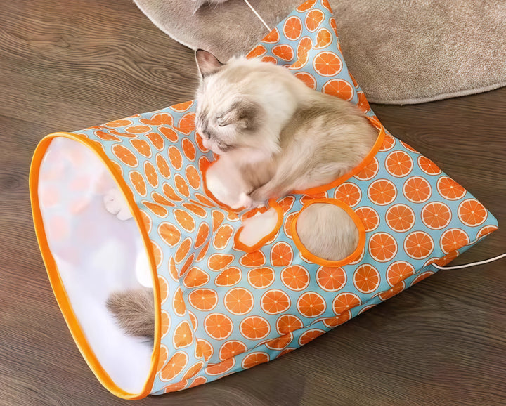 Cats are sensitive to high-saturation colors and concrete patterns. This tunnel uses a bold orange-and-blue color combination plus slice/bird prints, with orange trim on the edges to enhance the visual focus. It can quickly grab the cat's attention, encourage active exploration, and reduce destructive behavior.